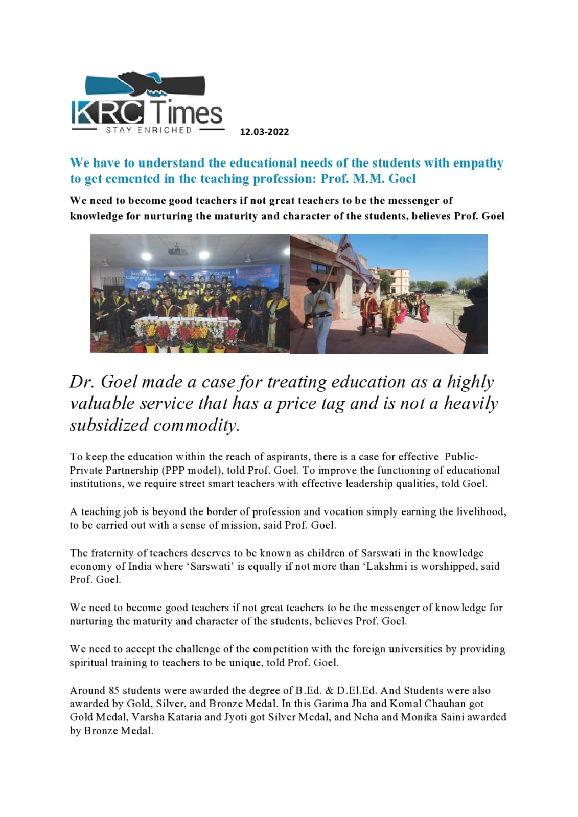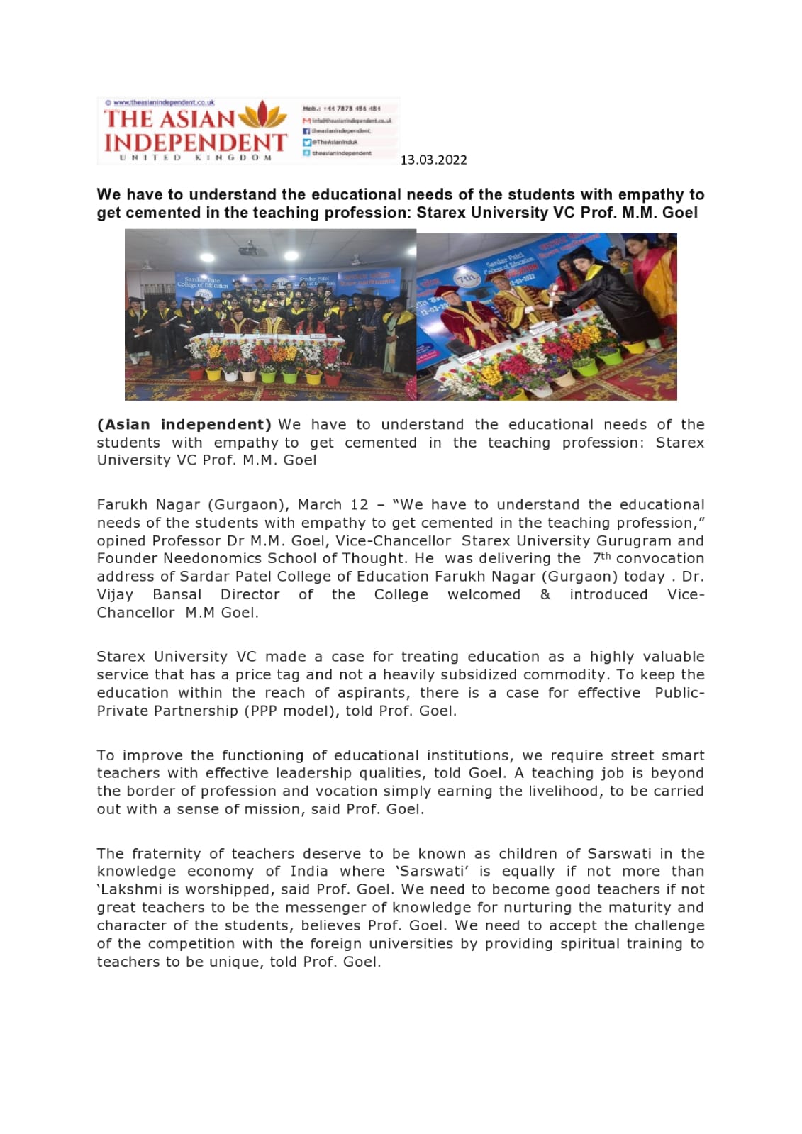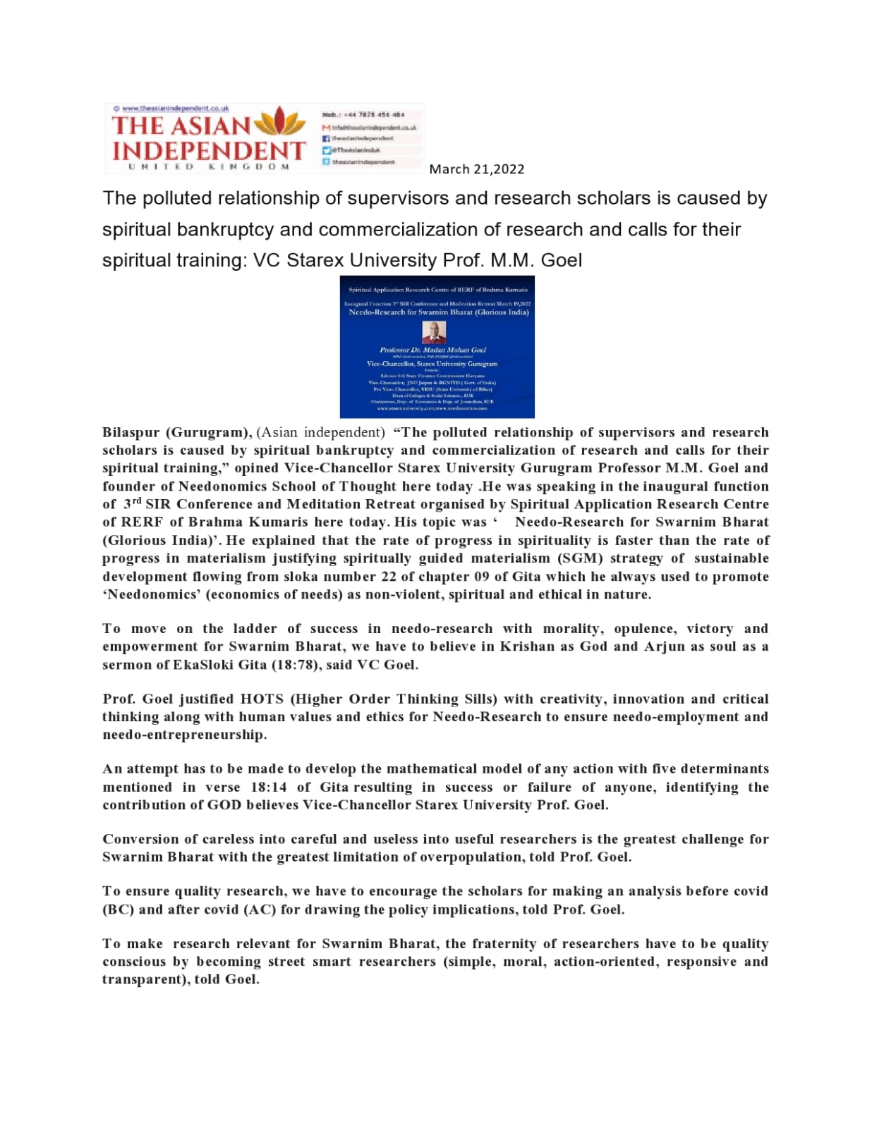 The polluted relationship of supervisors and research scholars is caused by spiritual bankruptcy and commercialization of research and calls for their spiritual training: VC Starex University Prof. M.M. Goel
