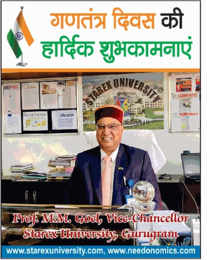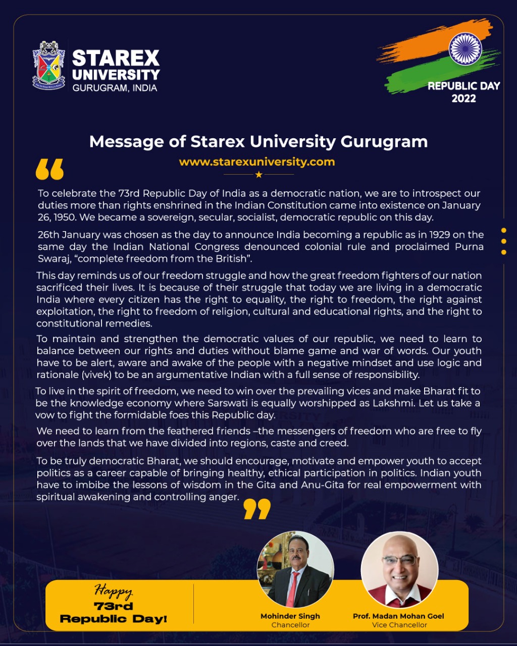 Message of Happy Republic Day Greetings from Professor M.M. Goel, Vice-Chancellor, Starex University