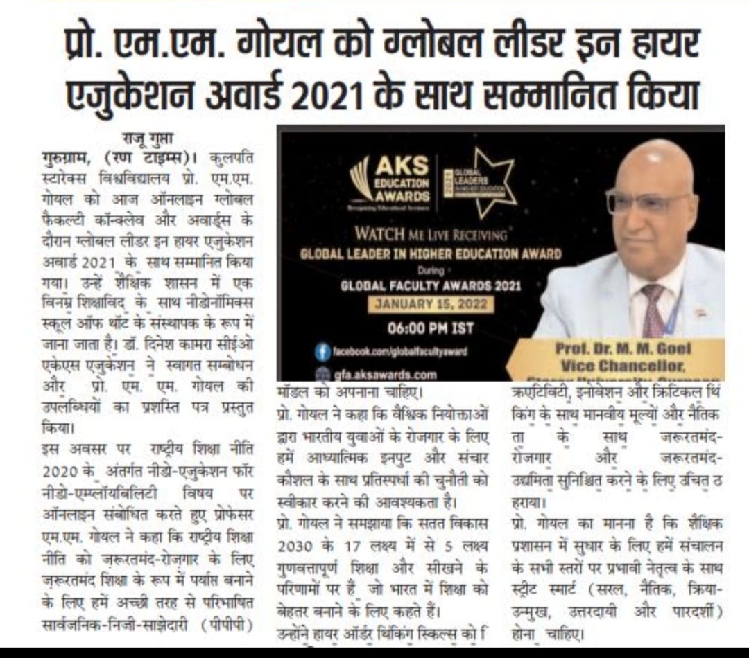 Prof. M.M Goel honourd with Global Leader in Higher Education Award 2021