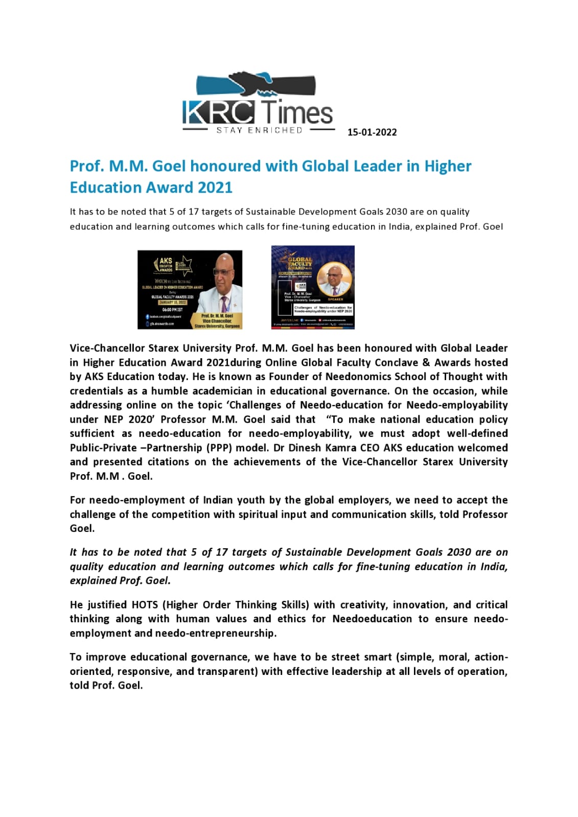 Prof. M.M Goel honourd with Global Leader in Higher Education Award 2021
