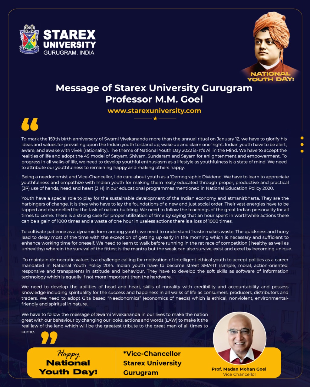 National Youth Day 2022: Message of Starex University Gurugram Professor M.M. Goel*