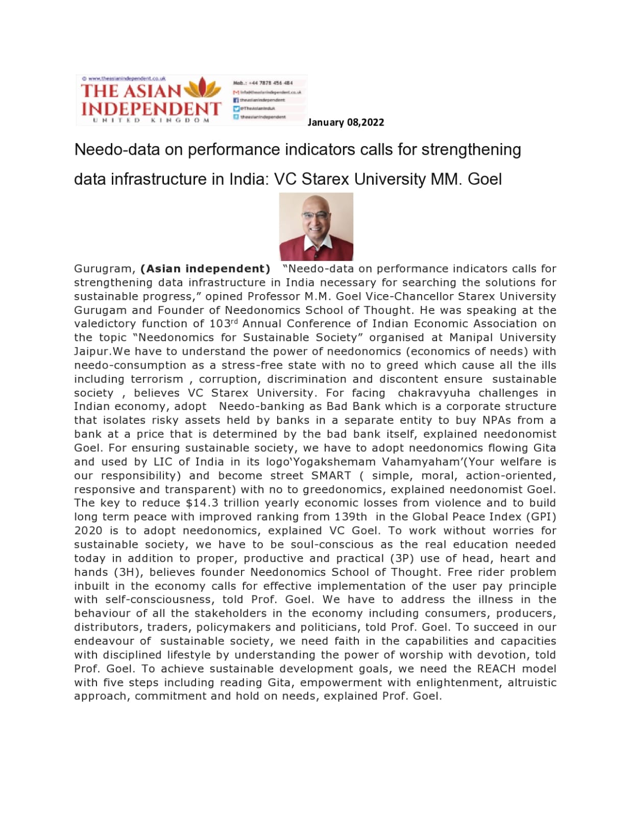 Needo-data on performance indicators calls for strengthening data infrastructure in India: VC Starex University MM. Goel
